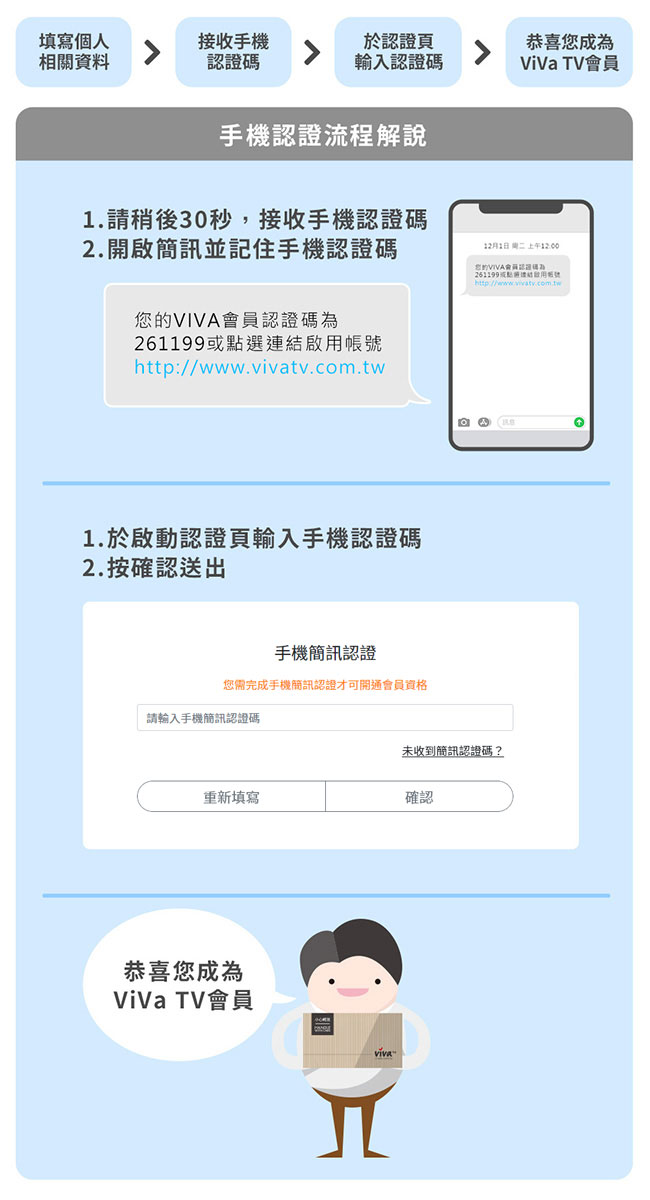 - 填入基本資料,系統確認資料無誤後,手機將收到認證碼,請於啟動認證頁輸入認證碼,登錄完成後即可開始使用網站各項貼心服務!